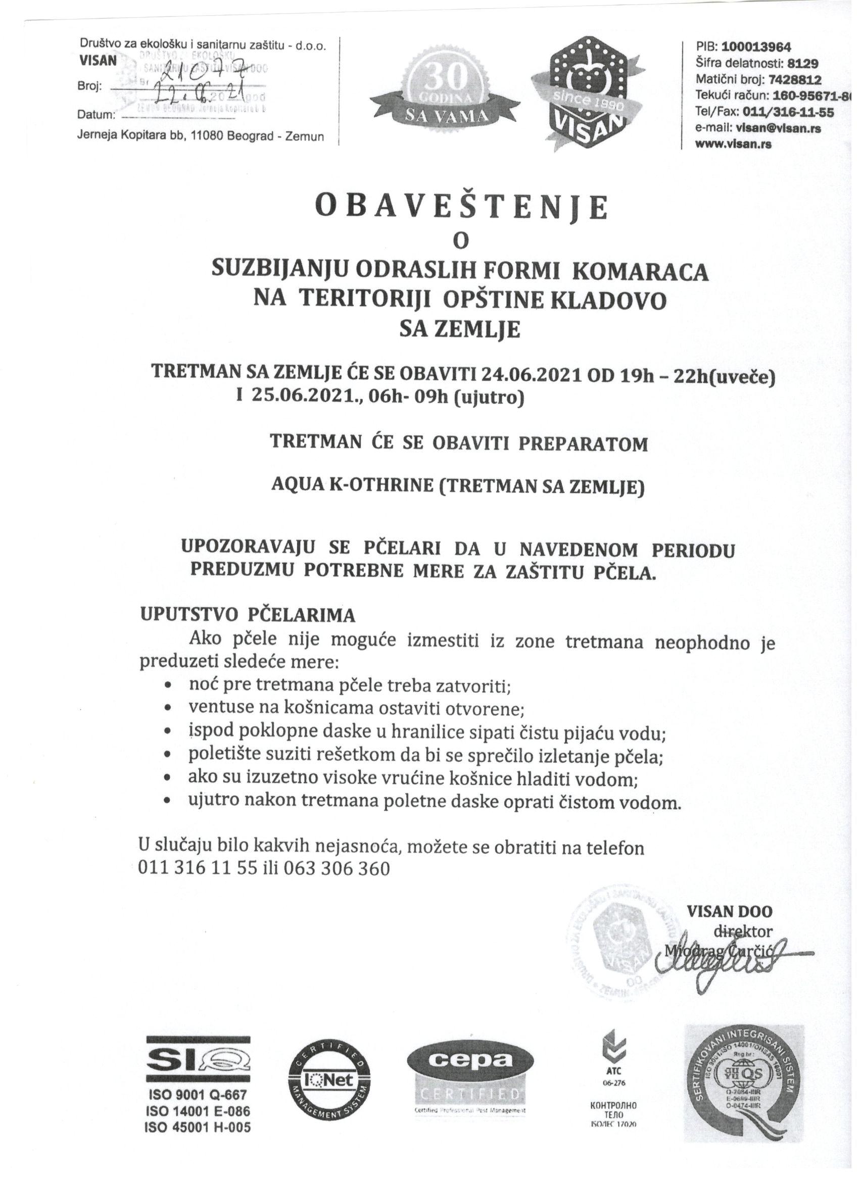 ОБАВЕШТЕЊЕ О СУЗБИЈАЊУ ОДРАСЛИХ ФОРМИ КОМАРАЦА